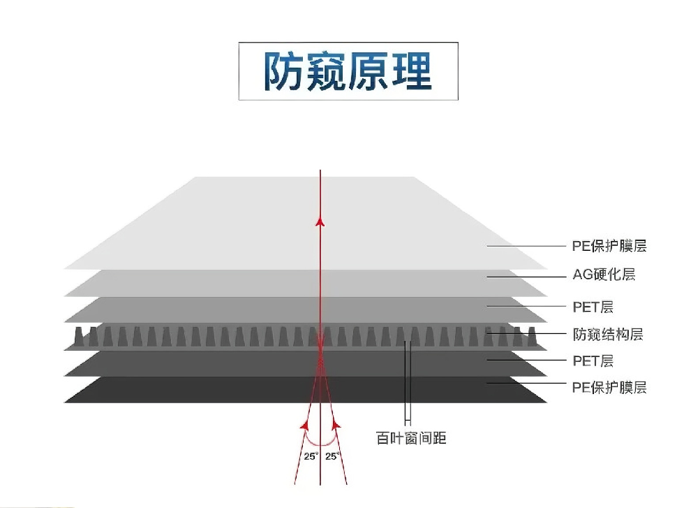 防窺膜是一種通過(guò)特殊光學(xué)技術(shù)限制屏幕可視角度的薄膜,其核心原理是利用微結(jié)構(gòu)光學(xué)設(shè)計(jì),使屏幕光線在特定角度外發(fā)生偏轉(zhuǎn)或吸收,從而限制他人從側(cè)面窺視屏幕內(nèi)容。