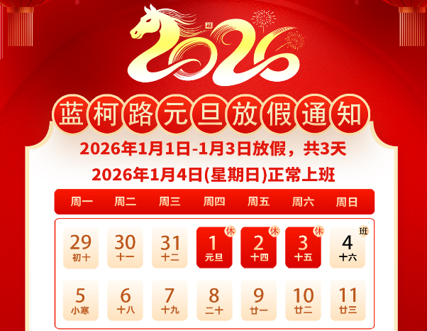 尊敬的客戶:2026年元旦即將到來(lái),根據(jù)國(guó)務(wù)院辦公廳發(fā)出的關(guān)于2026年元旦假期安排的通知,結(jié)合我司運(yùn)作情況,現(xiàn)將2026年元旦放假安排如下:元旦放假時(shí)間:2026年1月1日-3日,共3天。1月4日(星期日)正常上班。元旦假日期間藍(lán)柯路阿里巴巴店鋪照常營(yíng)業(yè),訂單發(fā)貨延遲到正常上班日(1月4日),在此期間如您有緊急