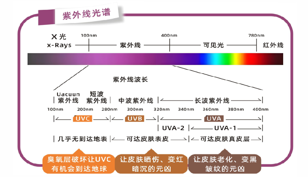 紫外線(Ultraviolet,UV)是電磁波譜中波長介于可見光和 X 射線之間的部分,波長范圍約為 10 納米(nm)至 400 納米。根據(jù)波長范圍和物理特性,紫外線可分為多個波段,其中UVA、UVB、UVC是常見分類,而DUV(深紫外)、EUV(極紫外) 則屬于更短波長的細分領域,在工業(yè)、科研等領域有特殊應用。